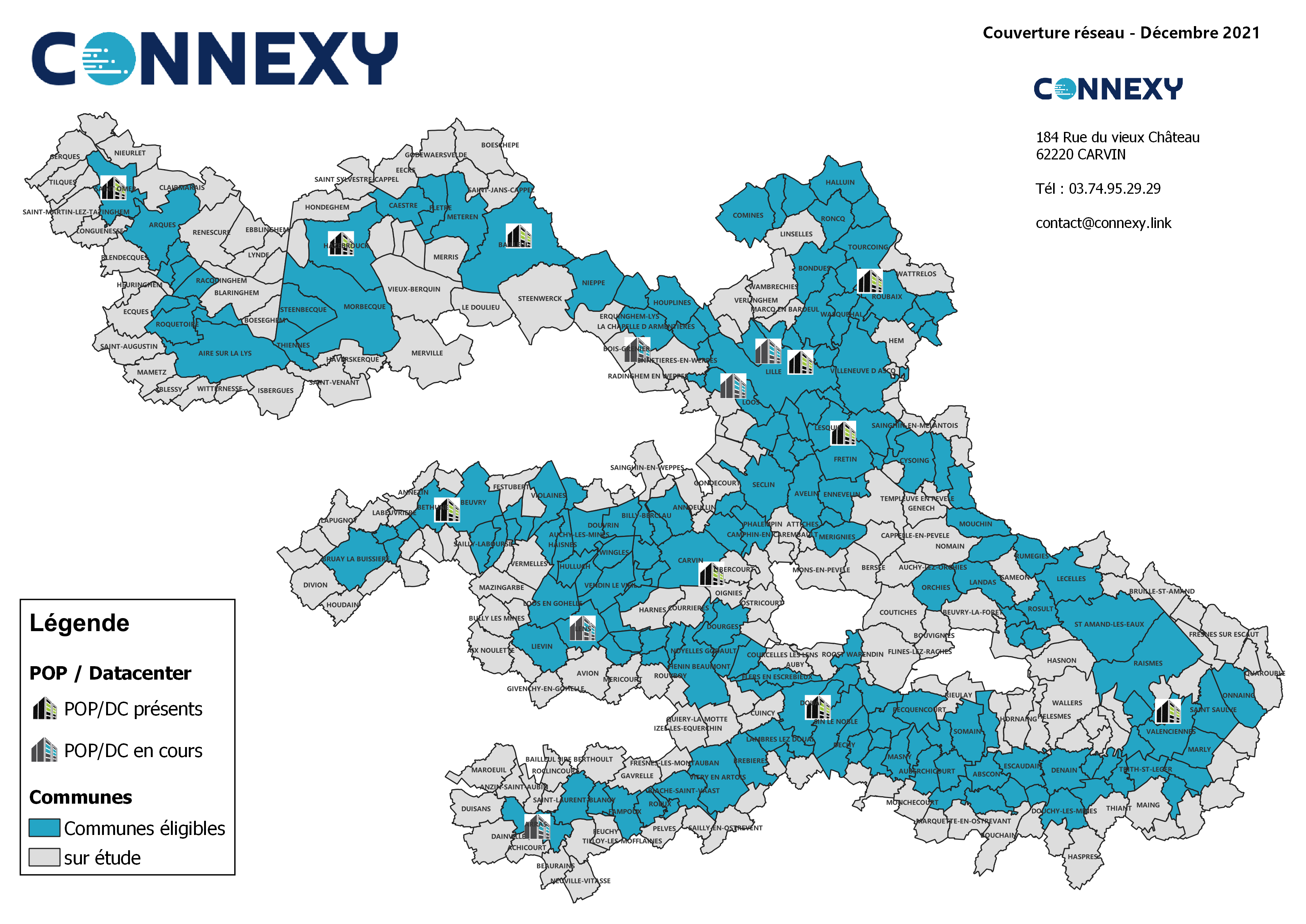 Le réseau Connexy de fibre optique s'étend sur plus de 500km et est disponible dans plus de 400 communes dans les départements du Nord et du Pas-de-Calais. Notre réseau évolue quotidiennement pour pouvoir proposer à de plus en plus d'entreprises : un accès internet à Très Haut Débit à des prix compétitifs.